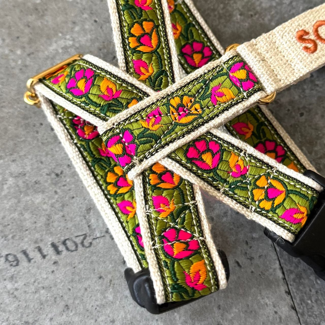 人気のフラワー柄のおしゃれなハーネス。愛犬の肌に触れる部分にはレーヨンと麻でつくられた肌触り抜群の生地を使用。ファッショナブルな高級感を演出してくれるだけでなく、首元への負担を考えた愛犬のための優しいハーネスです。