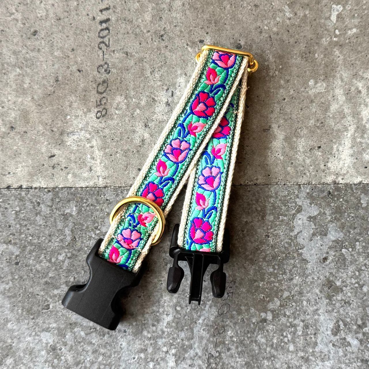 人気のフラワー柄のおしゃれな首輪。愛犬の肌に触れる部分にはレーヨンと麻でつくられた肌触り抜群の生地を使用。ファッショナブルな高級感を演出してくれるだけでなく、首元への負担を考えた愛犬のための優しい首輪です。