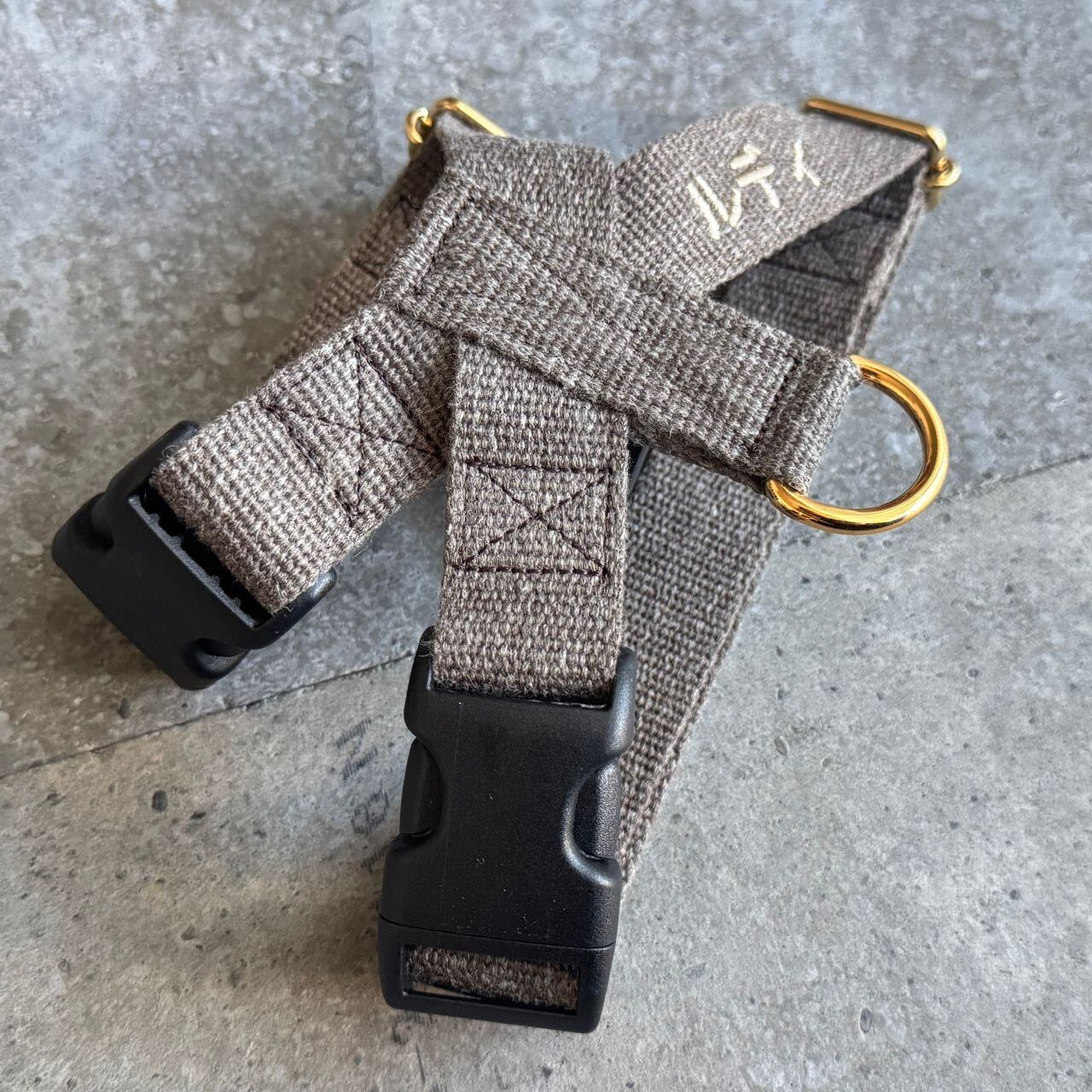 アクリルとリネン麻素材でつくられた、柔らかく肌触り抜群のシンプルなハーネス。耐久性が高く、使い込むほどに柔らかく味が出るのが特徴です。ファッショナブルな高級感を演出してくれるだけでなく、軽量設計で首元への負担を考えた愛犬のための優しいハーネスです。 詳細 - アクリル70% リネン麻30% - 日本製 - ゴールドメッキ金具 - プラスチックバックル サイズ |XS|首まわり約18cm~25cm / 胴まわり約27cm~44cm |XS-S|首まわり約20cm~30cm / 胴まわり約30cm~47cm |S|首まわり約25cm~35cm / 胴まわり約32cm~50cm |S-M|首まわり約30cm~40cm / 胴まわり約39cm~60cm |M|首まわり約35cm~50cm / 胴まわり約46cm~70cm |L|首まわり約45cm~60cm / 胴まわり約55cm~80cm |XL|首まわり約55cm~70cm / 胴まわり約65cm~90cm - 幅 2cm / 2.5cm よりお選びいただけます。 ※ハーネス サイズの測り方 首まわり=首の付け根を1周計測してください。 胴まわり=胸囲、前脚の付け根を1周計測してください。 〜ご注文方法〜 幅・サイズをお選びください。 ※Lサイズ、XLサイズは+500円にて承っております。ご希望の場合は《大きいサイズへ変更》よりサイズをご選択ください。 ご注文方法〜 《種類を選択する》 サイズをお選びください。 《字体》 画像6枚目よりお好きな字体をお選びください。 《刺繍カラー》 画像7枚目よりお好きなカラーをお選びください。 《お名前》 刺繍いたしますワンちゃんのお名前をご入力ください。 例:LATTE、Latte、latte、ラテ、らて ※ 名入れが不要の場合は『不要』とご入力ください。 ※『記号』『絵文字』『電話番号』『メッセージ』『連名』の刺繍は承っておりません。 ※『漢字』も承っておりますが、文字が見えづらくなる場合がございます。 ※各サイズ一番小さく調整するとネーム刺繍の上に調整金具が干渉する場合がございます。サイズ選びに迷われた場合は、干渉しないよう調整し製作をいたしますので、ご購入お手続きの際に備考欄へご愛犬様の「胴まわりサイズ」をご入力ください。 ※調整し製作をいたしますので、調整幅が記載のサイズより小さくなる場合がございます。あらかじめご了承くださいませ。 ※デュラフレックス社のプラスチックバックル(=カチッとはめる黒いバックルです)を使用しております。ゴールドバックルへ変更をご希望の方はバックル変更(ゴールド金具)よりバックル(ゴールド金具)をご選択ください。 プラスチックバックルからゴールドバックルへ変更した際の重量差は「2cm幅+26g」「2.5cm幅+20g」です。 ※ハーネスにはバックルを2つ使用するため、重量差はバックル2つ分を表記しております。 〈犬具についての注意事項〉 事故防止のため、飼い犬の目が届く範囲でご使用ください。毎回使用時には必ず適応サイズを守り、各部に異常がないか、セット後は外れないか十分に点検を行ってください。力が極度に強い、噛み癖や引っ張り癖がある、お散歩中に他のワンちゃんを見ると走り出す癖がある等に該当するワンちゃんには絶対に使用しないでください。お散歩専用ですので、お散歩以外の用途でのご使用はお控えください。犬具は消耗品のため、使用頻度・使用環境によって耐久性が大きく変わってきます。金属パーツのさび、縫製箇所のほつれなどの消耗箇所が見られたら、事故防止のため早めに新しいものにお取り替えください。使用状況によりますが、約6ヶ月を目安に買い替えをおすすめしております。