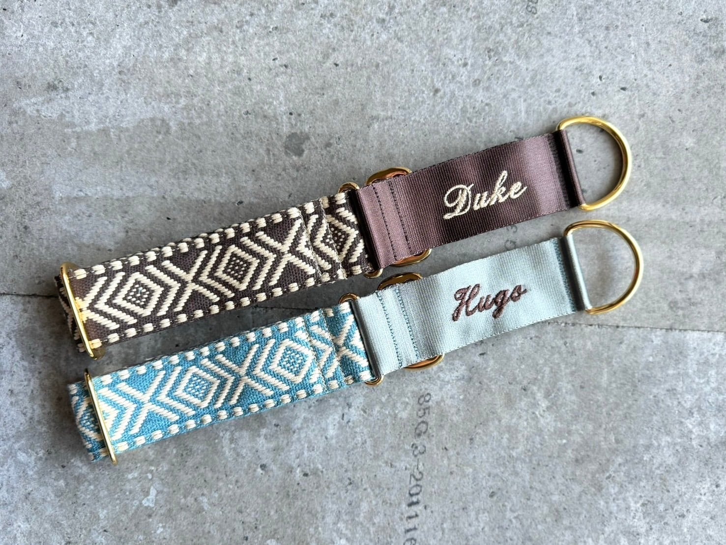 インテリアの分野でも注目を集めるオルテガ柄のおしゃれなハーフチョーク。38mmの幅広デザインで被毛に埋もれることなく、愛犬への喉への負担も考えた優しいカラーです。