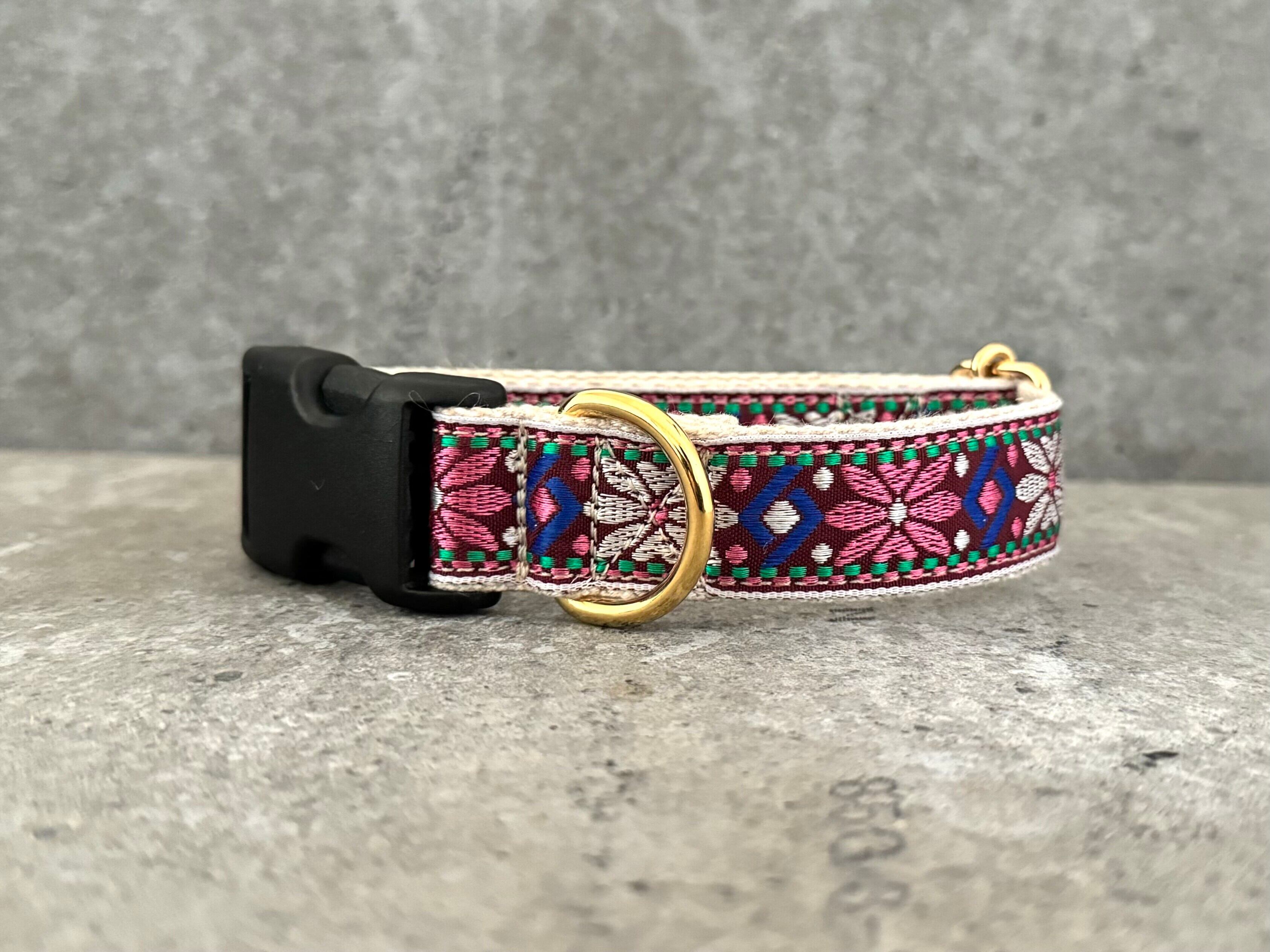 人気のフラワー柄のおしゃれな首輪。愛犬の肌に触れる部分にはレーヨンと麻でつくられた肌触り抜群の生地を使用。ファッショナブルな高級感を演出してくれるだけでなく、首元への負担を考えた愛犬のための優しい首輪です。